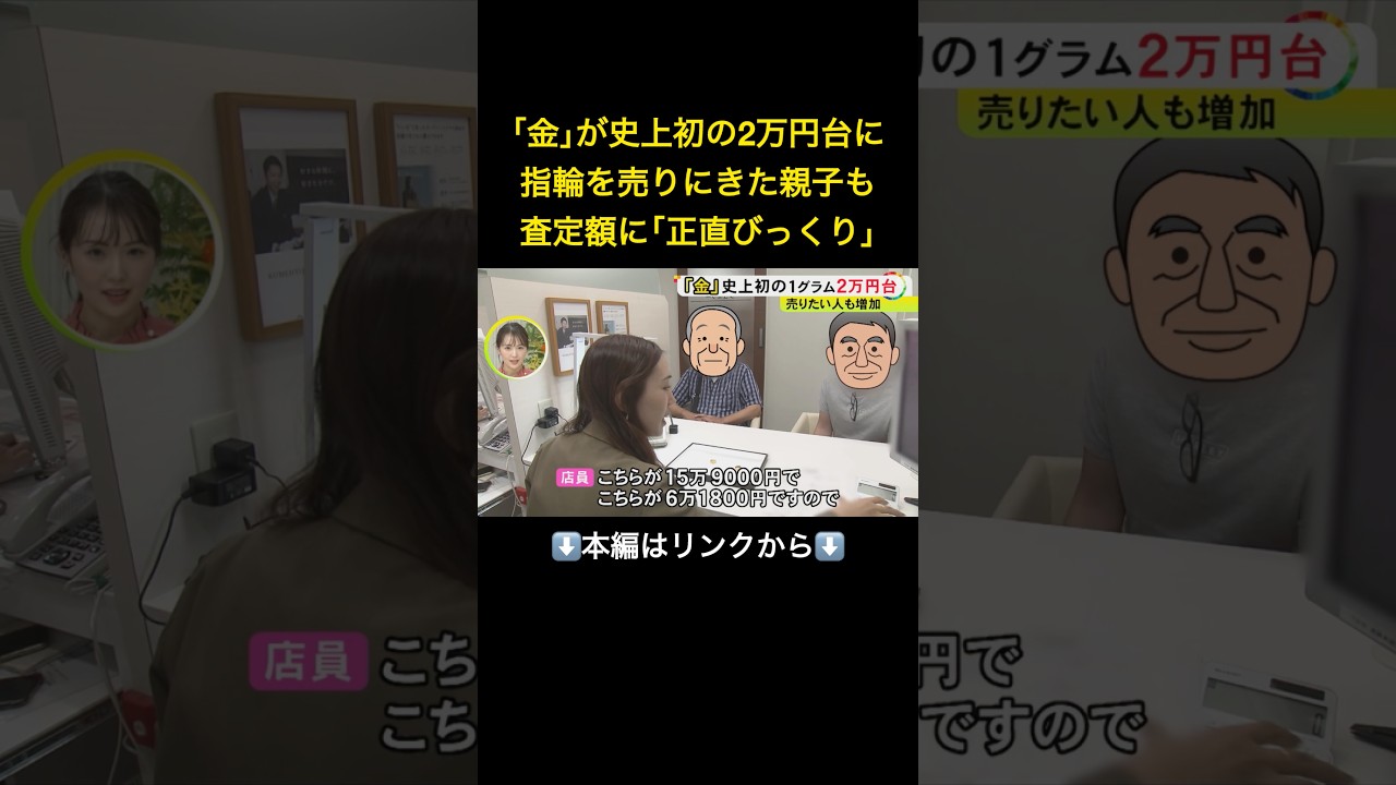 ⬆️本編はリンクから⬆️「永遠に上がり続ける」と予想する専門家も…金の価格が史上初の2万円突破 買取店には査定に訪れる人が増加中#shorts ニュース X Facebook Hatena Bookmark Pocket LINE Copy 2026.02.05 金の価格が、史上初めて2万円の大台を突破しました。名古屋の買い取り店には、眠っていた指輪などを売りに来る人が続々と訪れていて、査定額に驚きの声があがっていました。今後も金の価格は上がり続けるのでしょうか。 2025年9月30日放送 #ニュースONE